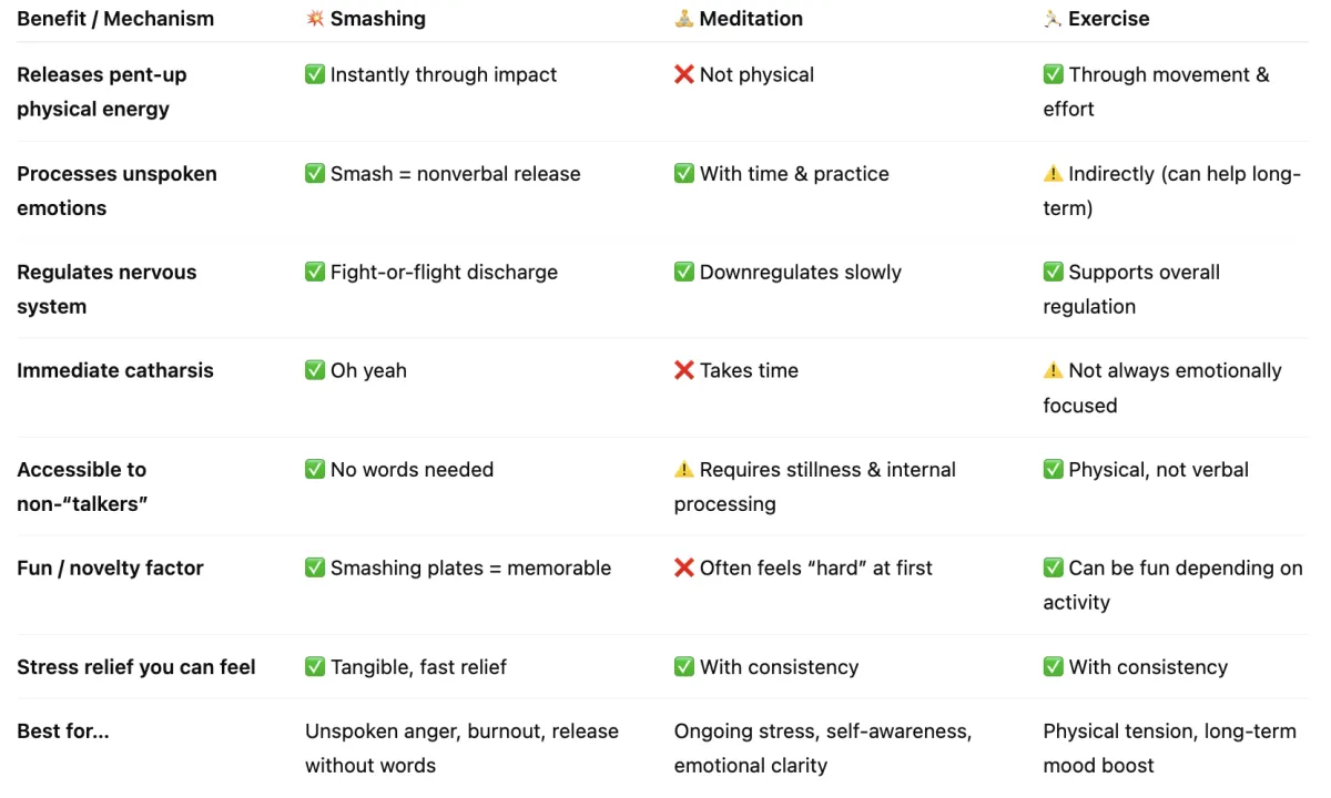 Smashing lets your body physically act out what your mind hasn’t processed yet. You don’t have to explain it. You just have to move through it.